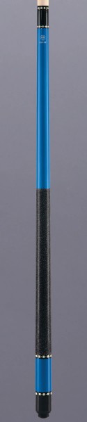 Lucky L11 cue has a painted blue Maple forearm and butt sleeve. Completing the cue is a black and white Irish linen wrap and overlay index ring work.