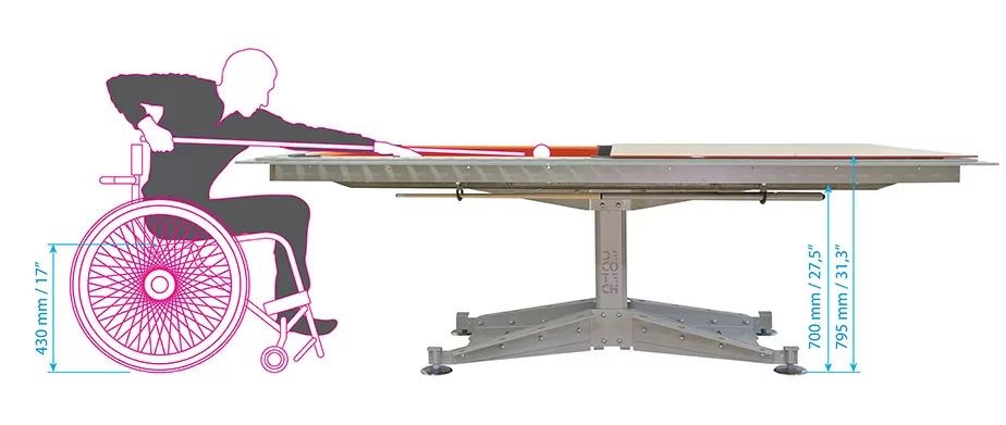 Now literally anyone can have the pleasure of the game since the Decotech has been specially designed for a person who uses a wheelchair as well. Nevertheless, its universal design allows to enrich any modern interior or quite contrary to bring contemporary feeling into more classical space. Table top holder, specially designed to match the table, allows you to flawlessly enjoy the game any time you want. Forget about the old-fashioned cue and ball holdings since now you can store your cues under the table top and put the balls under the table.