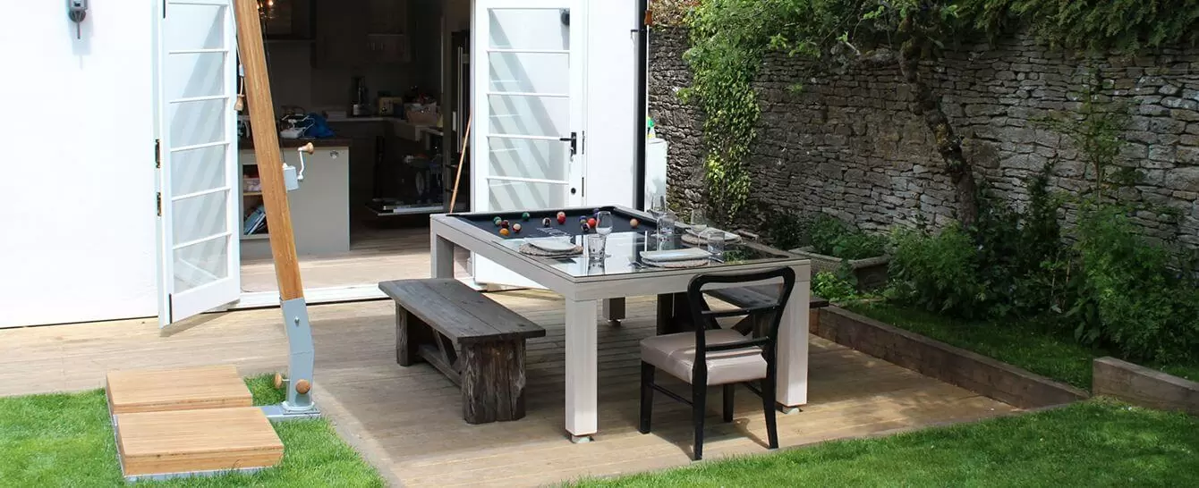 Vision Outdoor – dual purpose pool/dining table for outdoor. This table is created on Pronto Vision basis, so all features are the same like Pronto Vision, except lifting and ball return systems (they are not available for outdoor).
