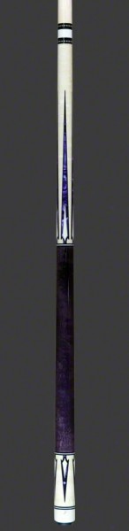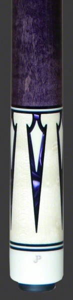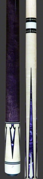 Pechauer JP14S pool cue has a Birdseye Maple forearm and butt sleeve with 4 matching purple pearl point floating inlays at each base. Completing cue is dash ring work, an off-white butt cap, joint collar, and purple stained no wrap section.