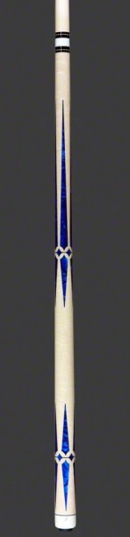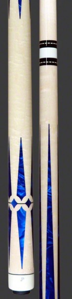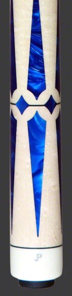 Pechauer JP15-S pool cue. This cue has a light natural Stained Figured maple forearm and butt sleeve with a figured maple no-wrap section. This cue has blue pearl diamond inlays with blue floating points. Completing this cue is a pearl white butt cap.