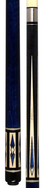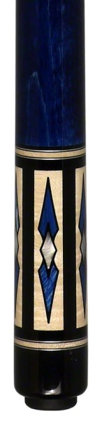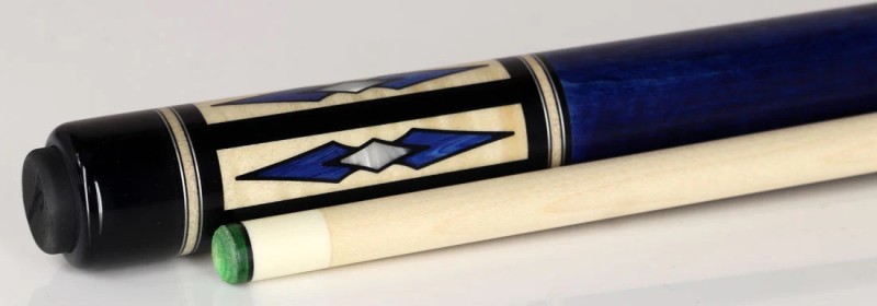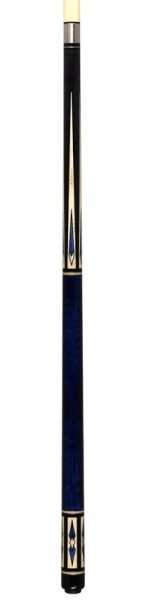 The Pechauer Pro Series P10-N Pool Cue exudes sophistication, featuring an ebony-stained maple cue with a blue-stained figured maple wrap section. The no-stain maple points provide a stunning contrast with simulated ebony framed blue Juma gem and pearl inlays. An exclusive and elegant pool cue worthy of your collection.