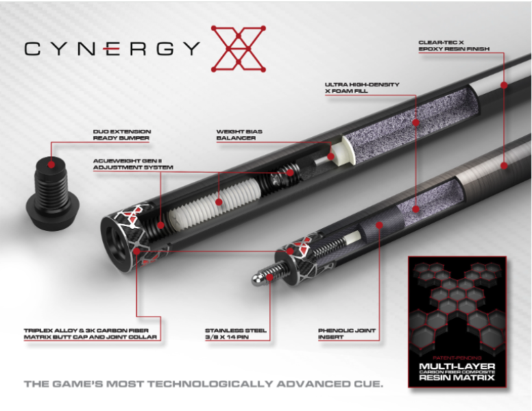 Engineered to unleash the full potential of the Cynergy series of carbon fiber shafts, Cynergy X cues are the game’s most technologically advanced playing cues. Featuring all-new advanced carbon fiber composite materials, constructions, and components from top to bottom, Cynergy X cues produce a more active and precise stroke delivery experience, with effortless power, increased consistency, and additional control, further unlocking your game’s potential. Zero wood, zero compromises, 100% Cuetec.