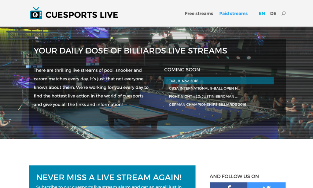 Patrick Baumann, from the blog playing-pool.com, and his partner Lennart, two billiard geeks like you and me, are the creators of Cuesports Live. His idea is very simple: to put in one place all (or almost all) the competitions of billiards that have a live broadcast. In this way they allow us (and allow themselves) to enjoy the games of snooker, pool or carom when we feel like it.